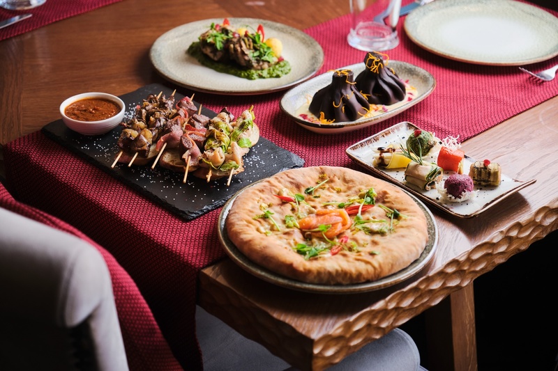 - Запеченный баклажан с овощной сальсой, паштетом из птицы, ореховым соусом и выдержанным деревенским сыром
