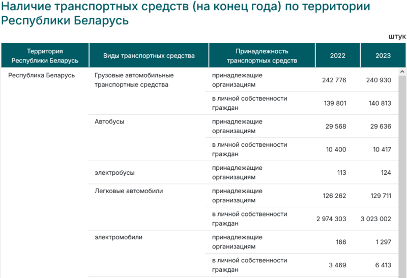 А вот официальные данные Белстата. Конец 2022 года: 3.635 электромобилей, конец 2023 года: 7.710 (сумма электромобилей в частной собственности и в собственности организаций).