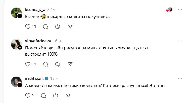 «Благодарим вас за подробный отзыв — мы уже передали информацию на производство для анализа ситуации и проведения дополнительных тестов эксплуатации и стирки. Пожалуйста, обратитесь с данными колготками в магазин, где была совершена покупка (или в ближайший фирменный магазин, если покупка была в фирменной рознице или интернет-магазине). Нам важно увидеть изделие вживую для более точного понимания проблемы», — ответил представитель бренда.