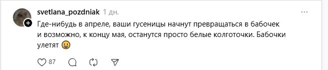 «Где-нибудь в апреле ваши гусеницы начнут превращаться в бабочек и, возможно, к концу мая останутся просто белые колготочки. Бабочки улетят».