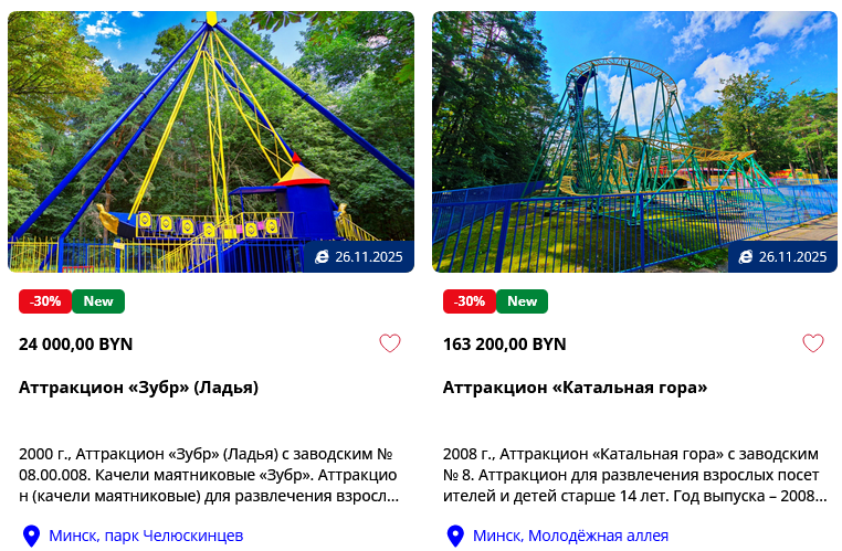 В начале октября Blizko.by первым рассказал, что на аукцион выставили знаменитый аттракцион «Супер-8» из минского Парка Челюскинцев. Официально он называется «Катальная гора». Также на торги выставили аттракцион «Зубр» (он же «Ладья»).