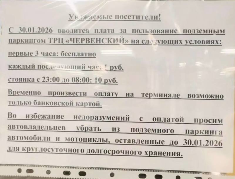 С момента открытия в мае 2024-го торгового центра «Червенский» в центре Минска у него была бесплатная парковка. Но теперь правила поменялись, сообщает ТЦ. Сейчас парковка становится платной, правда, остается бесплатным немалый временной промежуток.