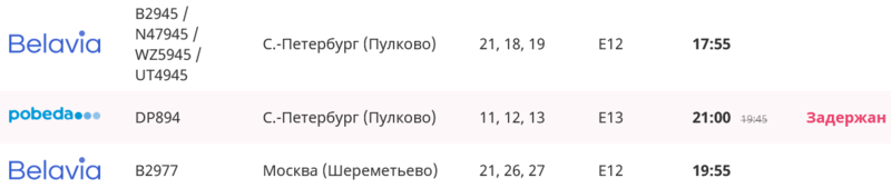 Онлайн-табло Национального аэропорта Минск не отмечает, что рейс «Белавиа» с временем вылета из Санкт-Петербурга в 10:50 (прибытие в Минск в 12:20) задерживается, но подтверждает, что будет задержан рейс «Победы» (время вылета из Питера 17:45, прибытие в Минск в 19:15).