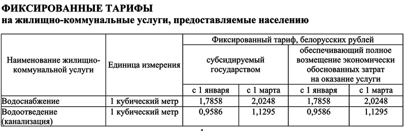 В случае водоснабжения фиксированный тариф, субсидируемый государством, с 1 января составляет 1,7858 рубля за 1 куб. м, с 1 марта — 2,0248 рубля. Для водоотведения (канализация) — 0,9586 и 1,1295 рубля соответственно. Для обеих услуг тариф, обеспечивающий полное возмещение экономически обоснованных затрат на их оказание, не отличается от субсидируемого.