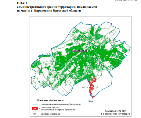 Согласно положениям нового документа, значительный участок земли, ранее входивший в черту города Барановичи, а именно земельные владения фермерского хозяйства «Зооландшафтный парк» общей площадью почти 100 гектаров (а точнее 99,79 гектара), теперь переходит в состав Барановичского района.