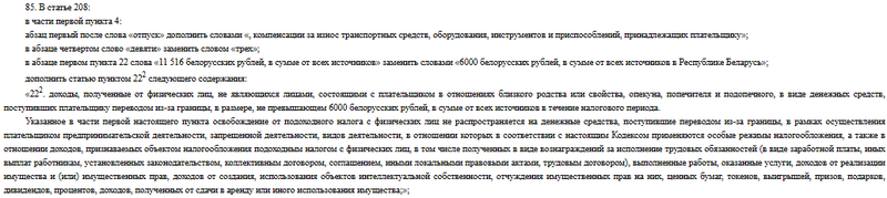 В Беларуси рассматривается возможность внесения изменений в налоговое законодательство, касающихся налогообложения подарков. Согласно опубликованному на Национальном правовом интернгет-портале законопроекту, необлагаемая налогом сумма подарков может быть снижена с текущих 11 516 белорусских рублей до 6 000 рублей. В случае превышения этого лимита, с разницы будет взиматься налог в размере 13%, а также потребуется подача налоговой декларации. Исключение составляют денежные займы от близких родственников, задекларированные в установленном порядке, которые не будут облагаться налогом вне зависимости от суммы.