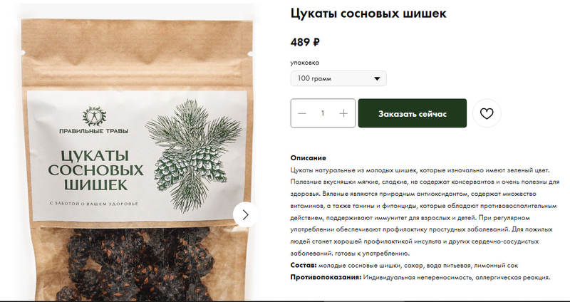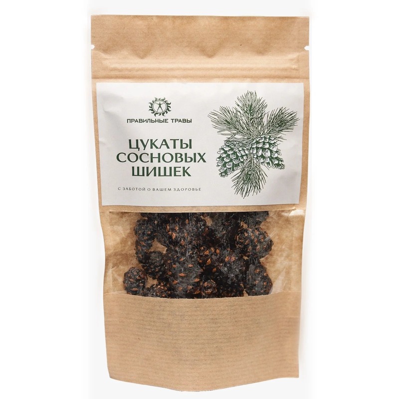 Пищевая ценность на упаковке не указана. Интернет-калькулятор калорийности подсказал, что в 100 грамм цукатов из шишек содержится 65 грамм углеводов и 260 ккал, остальные показатели (белки, жиры и другие) равны нулю. Однако стоит отметить, что пищевая и энергетическая ценности могут разниться у аналогичных продуктов в зависимости от технологии производства и состава.