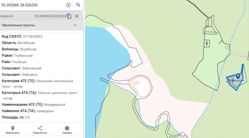 Blizko.by нашел его на публичной карте Национального кадастрового агентства Беларуси. Хутор находится недалеко от детского лагеря «Изумрудный», что рядом с озером Плисса.