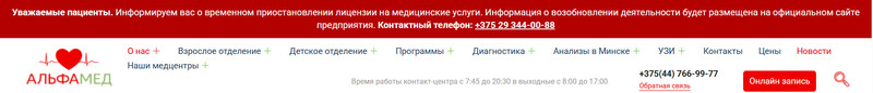 На сайте крупного белорусского медицинского центра «Альфамед» появилась информация о приостановлении действия лицензии. В сообщении сказано: «Уважаемые пациенты. Информируем вас о временном приостановлении лицензии на медицинские услуги. Информация о возобновлении деятельности будет размещена на официальном сайте предприятия».