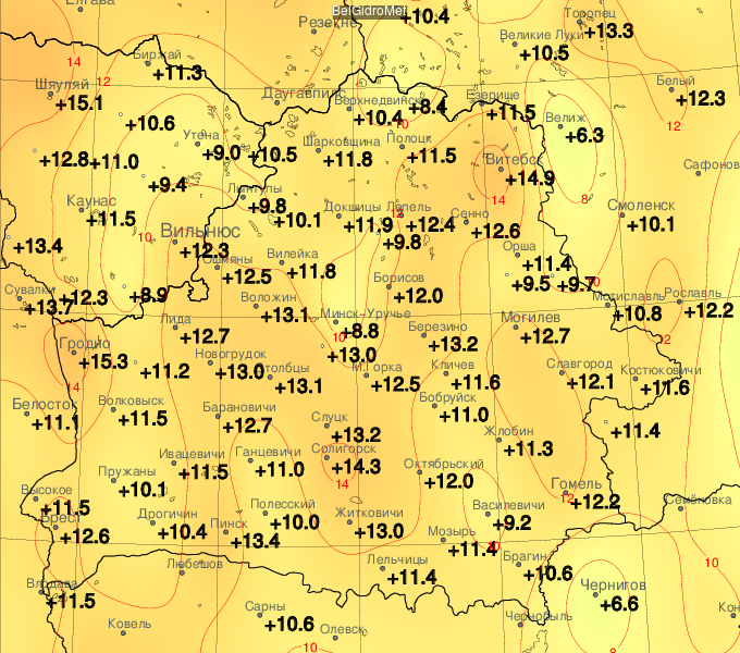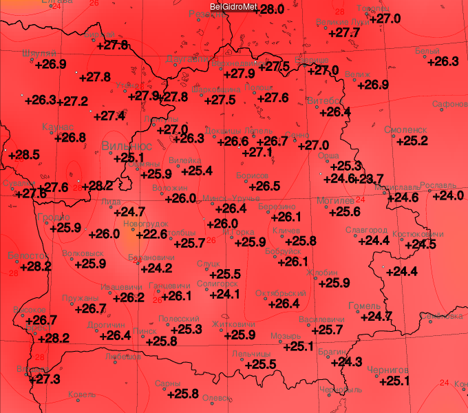 Жарко было равномерно по всей стране: максимальная температура почти везде перешагнула за +24°С (лишь в Новогрудке было «всего» +22,6°С, а в Горках +23,7°С), много где температура превысила +25°С, +26°С и +27°С.
