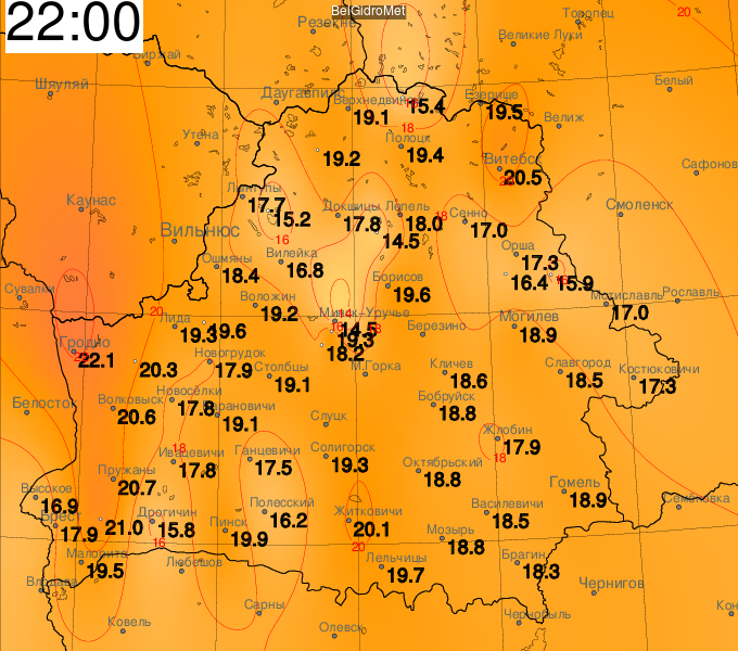 Жарко было даже поздно вечером и ночью. Так, по состоянию на 22 часа в Гродно температура держалась на уровне +22,1°С.