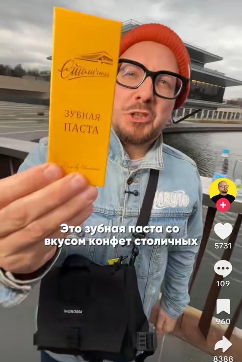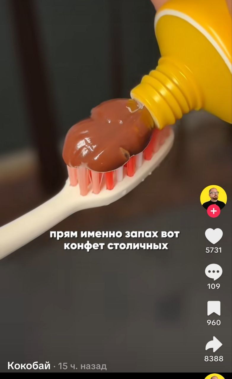 Новую зубную пасту шоколадного цвета показал у себя в соцсетях известный белоруский фудблогер Павел Крамарь — он же «Мерзкий Кокобай».