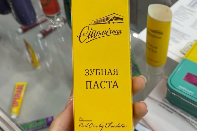 Средство для чистки зубов упаковано в желтую коробочку, на которой изображен силуэт столичного Дворца спорта. Здесь же надпись «Столичная» — и это явная отсылка к одноименным конфетам от «Коммунарки». И как мы знаем, детям такие конфеты строго не рекомендуются, потому что сладости несут в себе «алкогольные нотки».