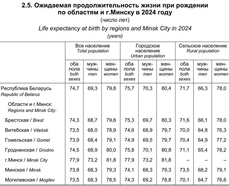 Самая высокая продолжительность жизни ожидается в Минске: в среднем 77,9 года. Самая короткая — в Витебской и Могилевской областях: по 73,5 года.