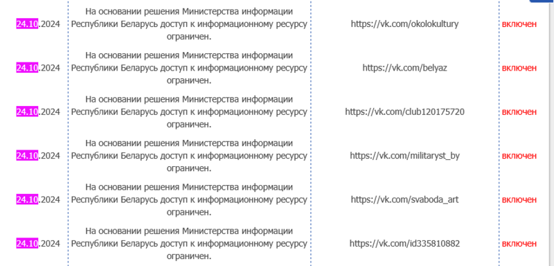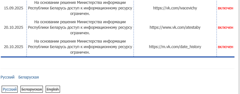 Blizko.by самостоятельно проверил список сайтов с ограниченным доступом. По состоянию на 22:40 пятницы 24 октября сайт VK.com среди заблокированных не значится. Последнее решение БелГИЭ датировано 20 октября 2025.