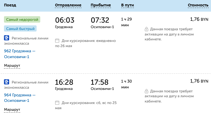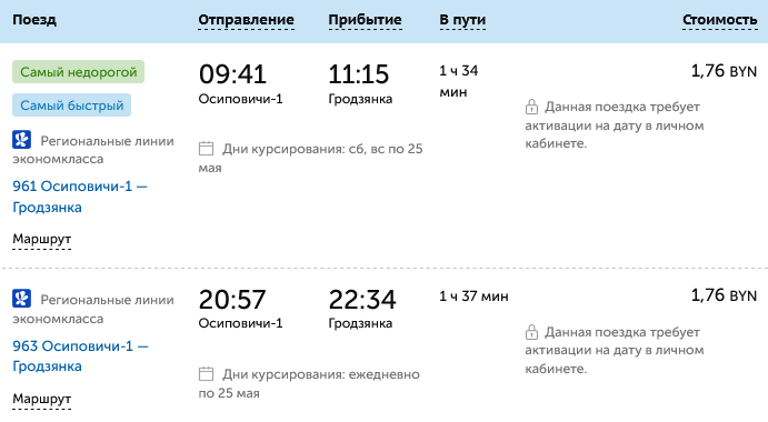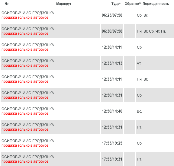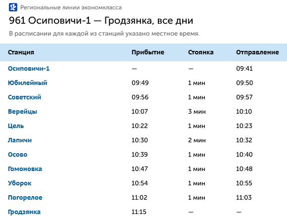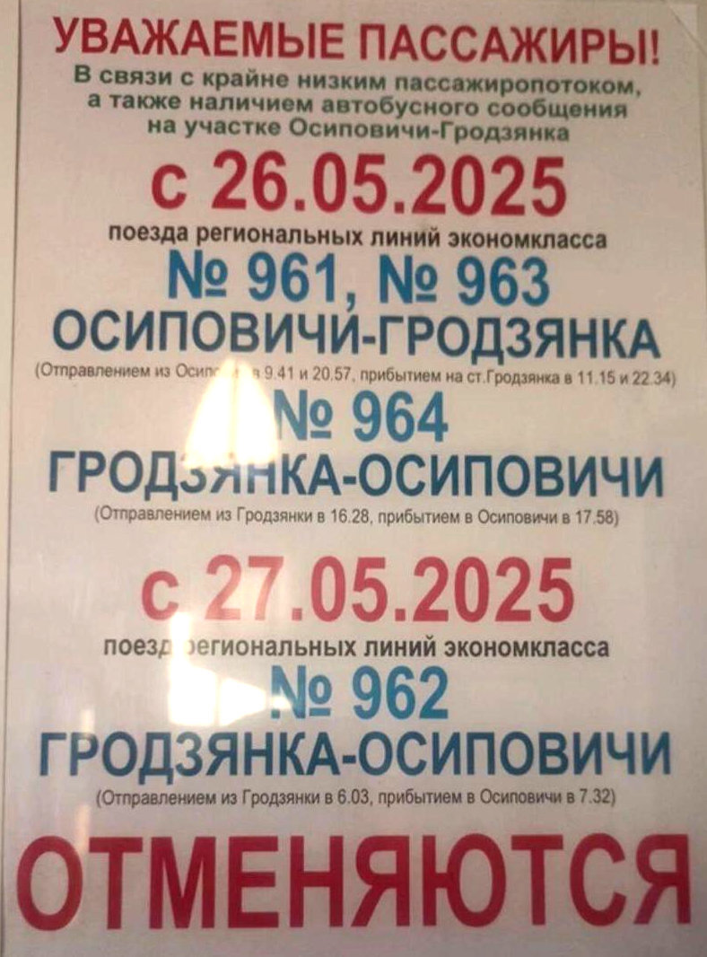 «С 26 мая 2025 года поезда региональных линий эконом-класса №961, №963 Осиповичи – Гродзянка (отправлением из Осиповичей 09:41 и 20:57, прибытием на станцию Гродзянка в 11:15 и 22:34), №964 Гродзянка – Осиповичи (Отправлением из Гродзянки в 16:28, прибытием в Осиповичи в 17:58); с 27 мая 2025 года поезд региональных линий эконом-класса №962 Гродзянка – Осиповичи (отправлением из Гродзянки в 06:03, прибытием в Осиповичи в 07:32) ОТМЕНЯЮТСЯ».