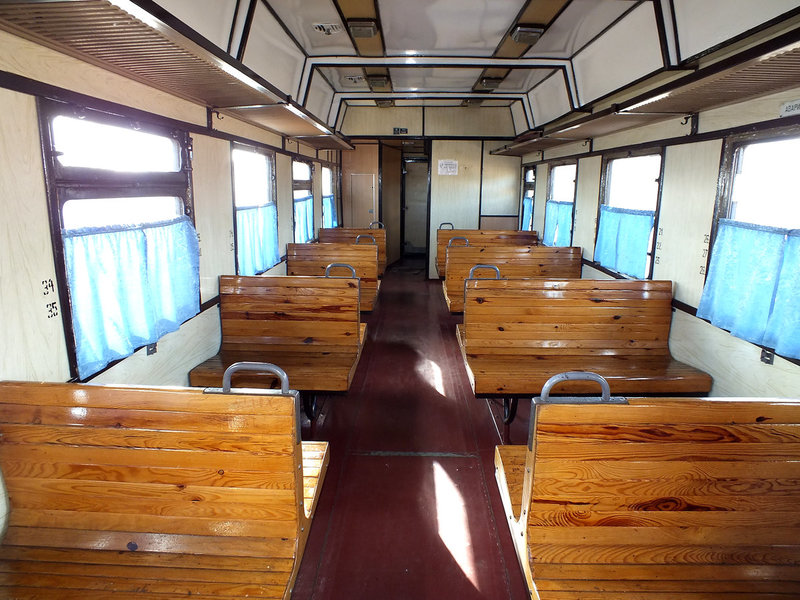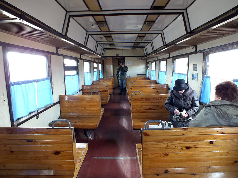 Еще одна особенность линии состоит в том, что это, похоже, последнее место в Беларуси, где можно прокатиться на вагоне с деревянными сиденьями. В день нашей поездки по линии к поезду был прицеплен лишь один пассажирский вагон: выпущен в 1976 году на Калининском вагоностроительном заводе (в Твери) и прошел несколько капремонтов на Гомельском заводе. Деревянные лавки, размещенные по схеме 2+3, пронумерованы, всего в вагоне 95 сидячих мест. Но такое число пассажиров едва ли когда-нибудь набиралось в поезде: чаще едут не более десятка, максимум двух десятков пассажиров, если только компания любителей железных дорог не отправлялась на «покатушки».