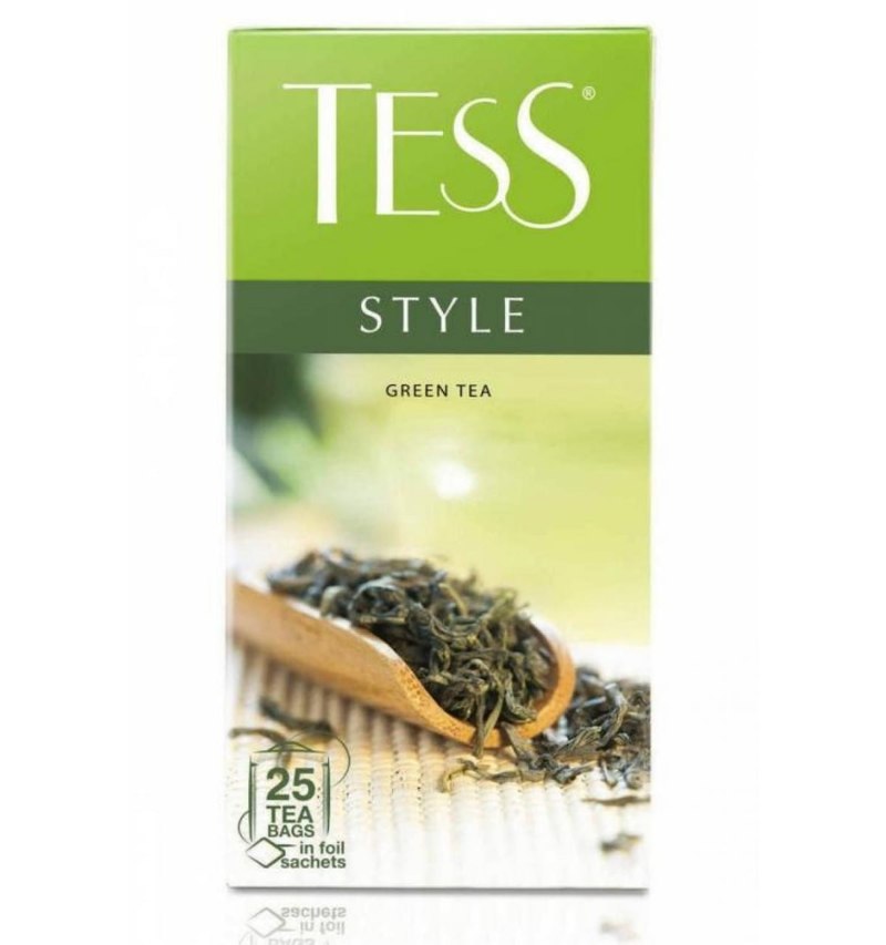 Речь идет о зеленом байховом чае бренда Tess Style, расфасованном в пакетики для разовой заварки.