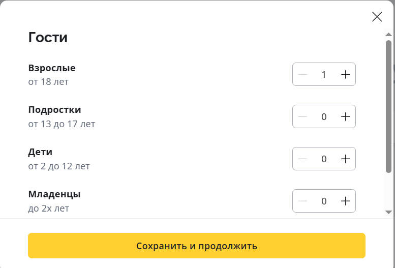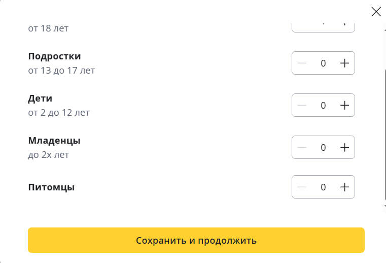Стоит отметить, что несовершеннолетнему (или вдруг, питомцу) снять квартиру не получится — система по умолчанию указывает одного взрослого для поиска и убрать значение нельзя.