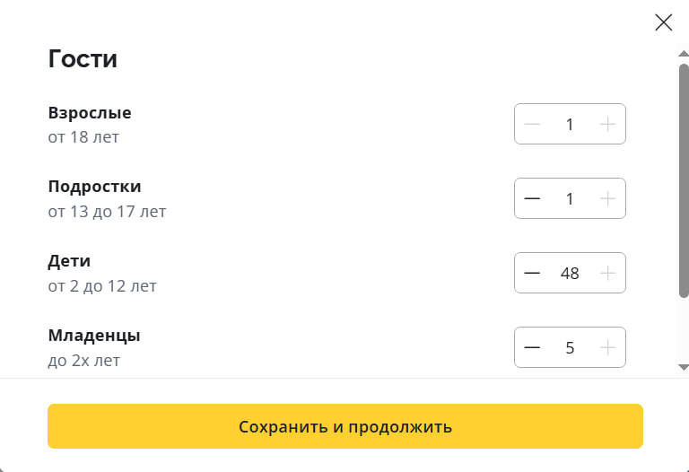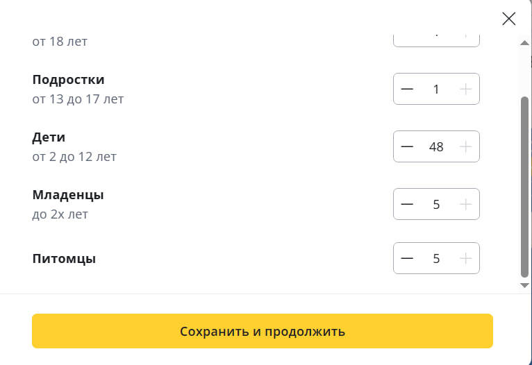 Количество проживающих также ограничено — в параметрах нельзя указать значения больше 55 человек разного возраста и пяти животных. К слову, варианты на такие запросы система просто не сможет предложить.