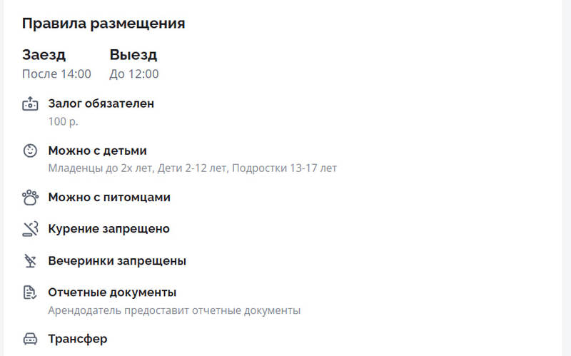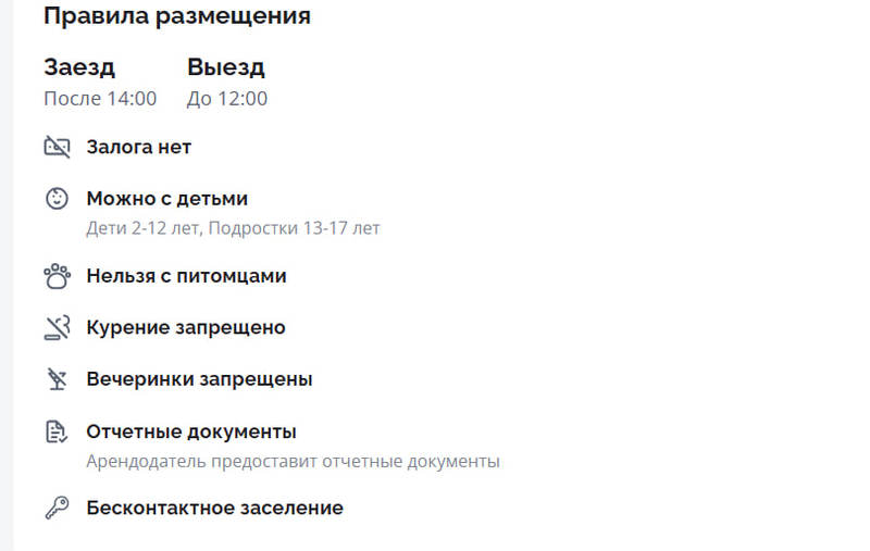 В карточке самой квартиры указываются правила проживания: наличие залога, можно ли курить, устраивать шумные вечеринки, подходит ли для трансфера и некоторые другие нюансы.