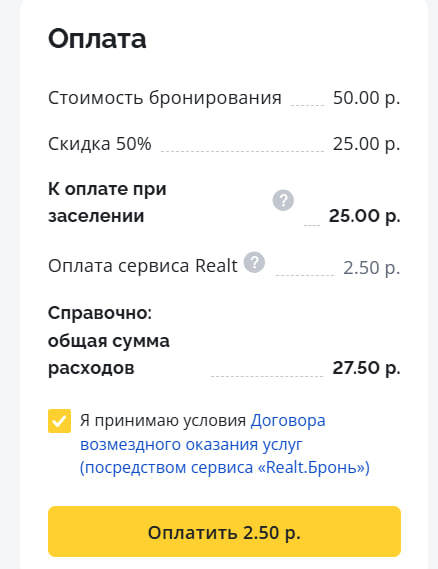 Итоговая сумма рассчитывается с учетом скидок и оплаты услуг сервиса Realt (плюс 10% к стоимости съема жилья). Все строчки расходов указываются на финальном этапе брони.