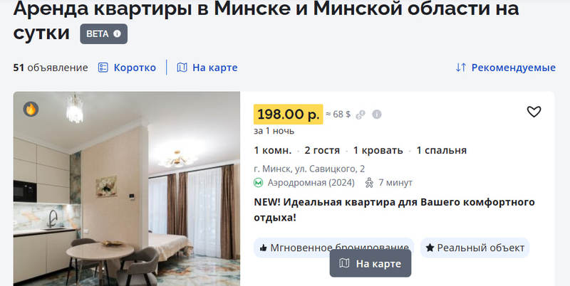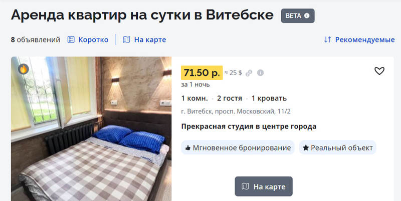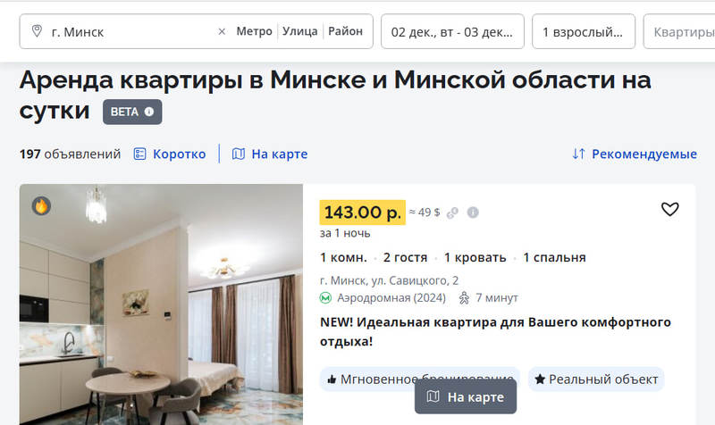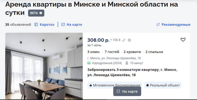 Выберем самый удобный для арендодателей вариант — один взрослый без детей и животных ищет квартиру в Минске. Система отыскала 187 вариантов в ценовом диапазоне от 27,50 рубля до 550 рублей. В списке вариантов были как и однушки, так и двушки, трешки и даже пятикомнатные варианты.