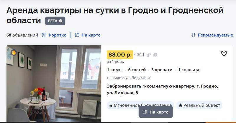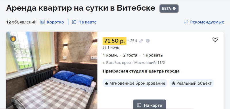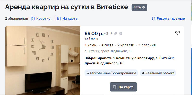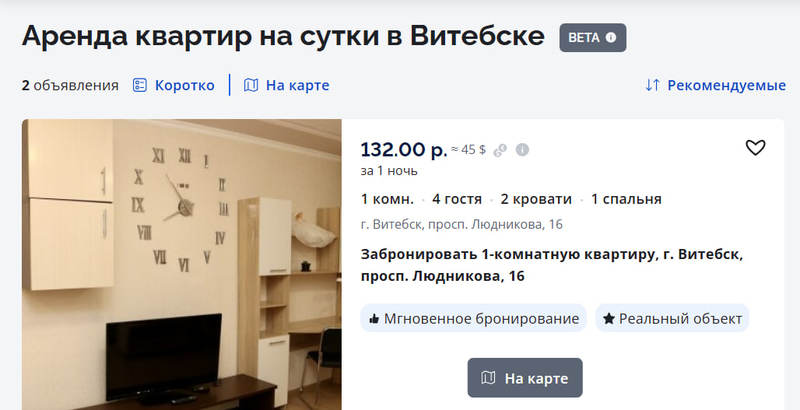А что если взять тяжелую артиллерию — многодетную семью с детьми разных возрастов и питомцем? Как ни странно, в Минске варианты все равно нашлись, хотя и всего 34 в том же ценовом диапазоне, что и для одного взрослого. В Витебске варианты тоже нашлись, хотя и всего два за 132 и 154 рубля.