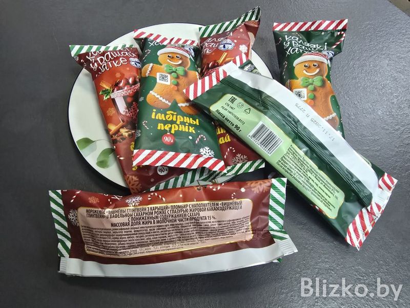 Линейка продукции завода пополнилась двумя видами мороженого, объединенных в серию под названием «Калядкі ў вашай хатке». Здесь представлены десерты двух вкусов — «Вишневый глинтвейн с корицей» и «Имбирный пряник». Различить их можно по цвету упаковки: зеленая — это имбирный пряник, а красная — вишня с глинтвейном.