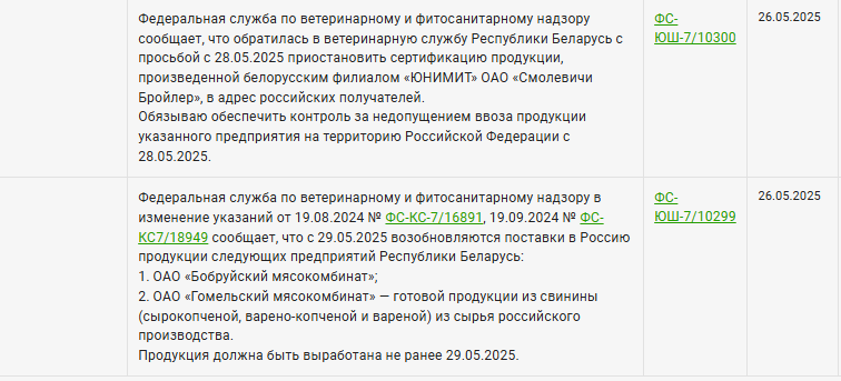 В то же время, Россельхознадзор ослабил ограничения в отношении других белорусских производителей. С 29 мая возобновлены поставки продукции Гомельского и Бобруйского мясокомбинатов.
