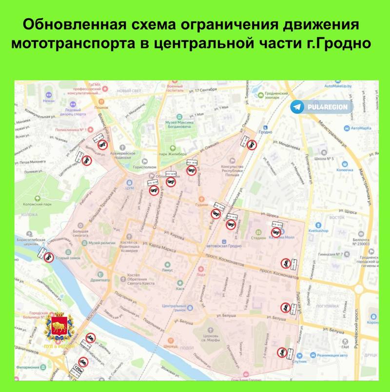 Телеграм-канал «Пул 4 Регион» сообщает, что в Гродно значительно расширили запретную зону для мотоциклов — теперь она занимает фактически весь центр города по правому берегу Немана.
