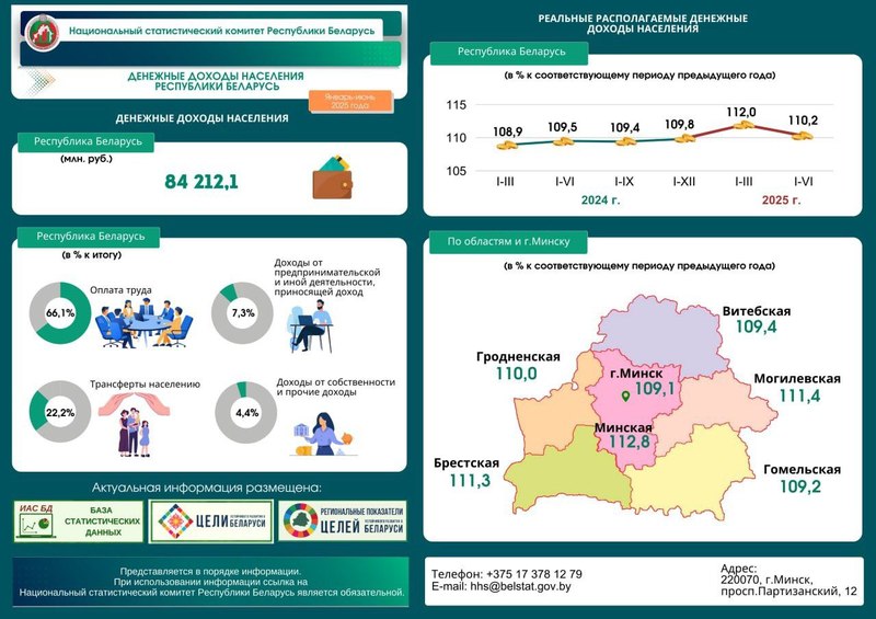 Наибольший рост реальных денежных доходов населения за первые 6 месяцев года продемонстрировала Минская область — 12,8%, далее идут: Могилевская область — 11,4% и Брестская —