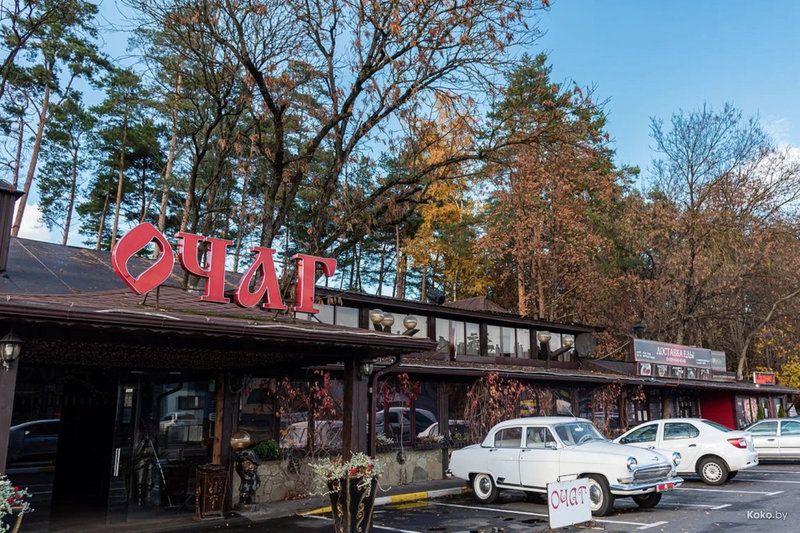 Кафе «Очаг» находится в развилке автодорог на Логойск и на Боровляны. Перед зданием кафе много лет стоял узнаваемый символ: огромный котел.