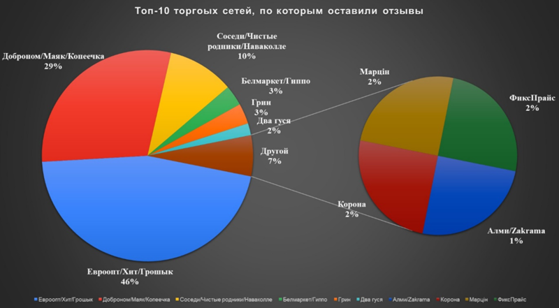 По данным МАРТ, наибольшую активность покупатели проявили в отношении таких торговых сетей, как «Евроопт», «Хит» и «Грошык» – 46%, «Доброном», «Маяк» и «Копеечка» – 29%, «Соседи», «Чистые родники» и «Наваколле» – 10%.