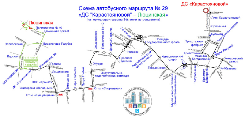 А вот новый маршрут автобуса №29 на период строительства 3-й линии метро. С 16 марта он продлевается до конечного пункта «Люцинская» по ул. Казимировской, Нёманской, Налибокской, Колесникова, Люцинской в обоих направлениях. Маршрут получает наименование «Карастояновой – Люцинская».