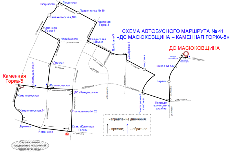 Автобус №41 идет по маршруту «Масюковщина — Каменная Горка-5» вот таким путем: