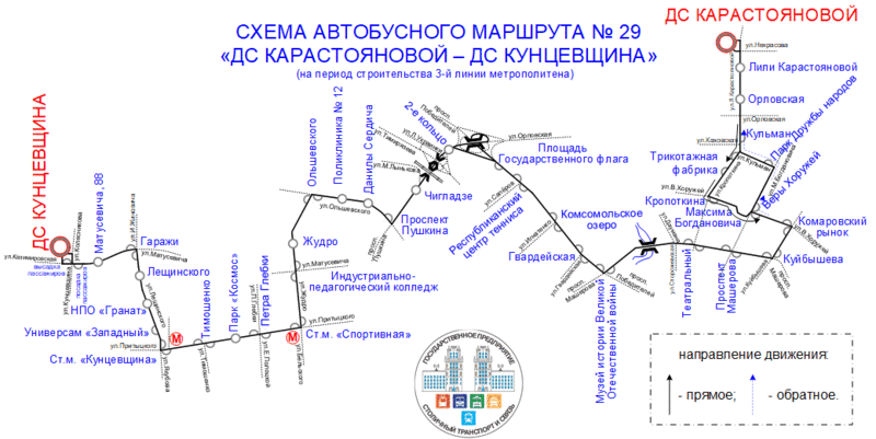Сейчас маршрута автобуса №29 такой: «Карастояновой — Кунцевщина». Вот его схема.