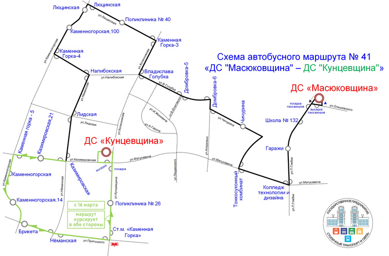 С 16 марта он пойдет в обоих направлениях по ул. Нёманской, Казимировской, Каменногорской, Притыцкого, Кунцевщина до диспетчерской станции «Кунцевщина». Маршрут получает наименование «Масюковщина – Кунцевщина».
