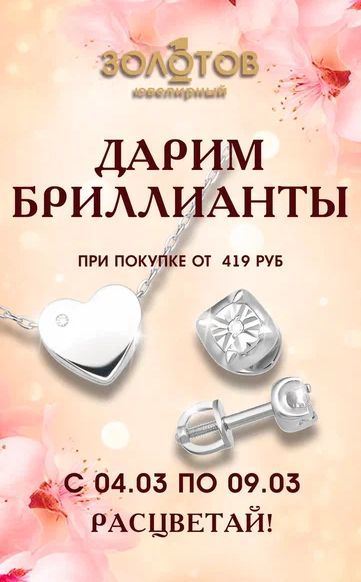 С 4 по 9 марта включительно работает специальное предложение: при покупке от 419 рублей покупательница получает в подарок серьги-пусеты с бриллиантами или колье в форме сердца с бриллиантом.