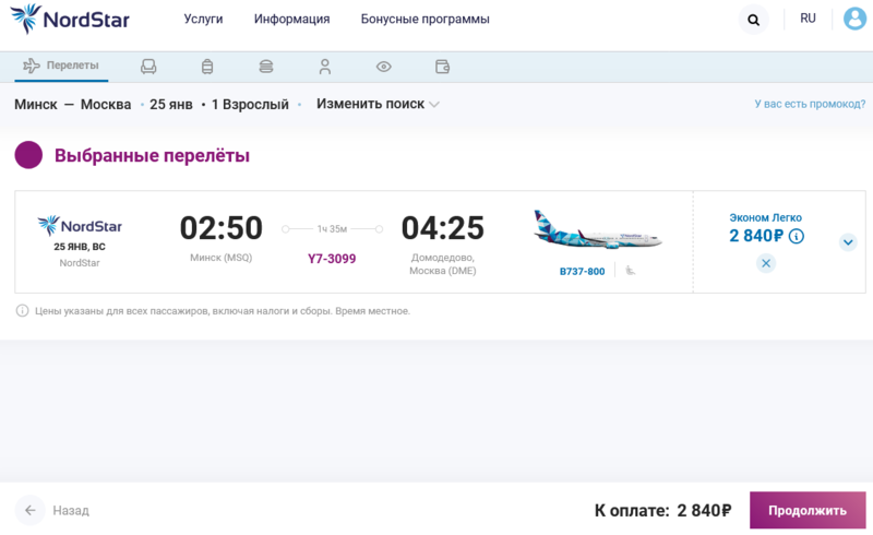 Пока что заявлен только один рейс: в воскресенье 25 января. Причем, что удивительно, сначала будет рейс из Минска в Москву, а в понедельник — из Москвы в Минск.