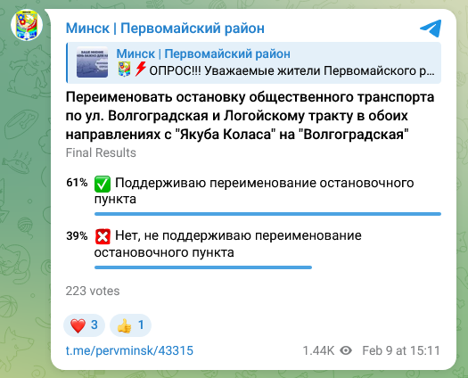 «В связи с поступившим предложением в администрацию Первомайского района о переименовании остановки общественного транспорта по ул. Волгоградская и Логойскому тракту в обоих направлениях с "Якуба Коласа" на "Волгоградская" предлагаем выразить мнение и поучаствовать в голосовании».