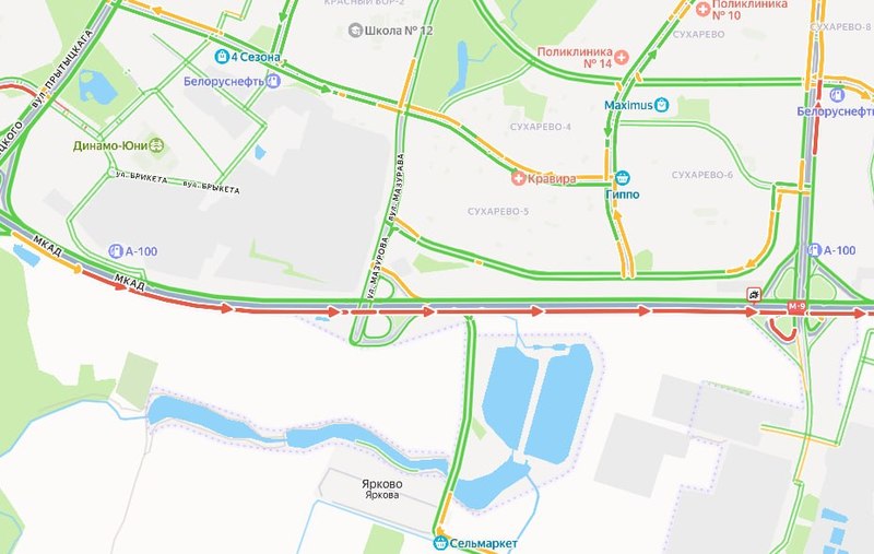 Заторы отмечаются по МКАД со стороны улицы Мазурова в направлении улицы Шаранговича.