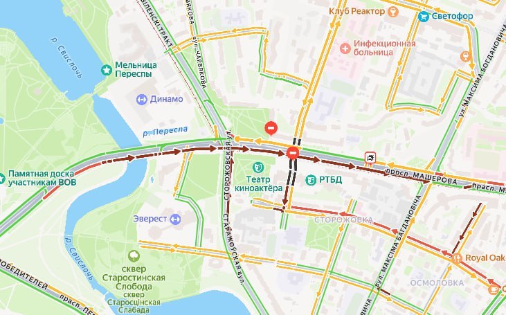 Трудности отмечаются по проспекту Машерова со стороны проспекта Победителей в направлении улицы Максима Богдановича.