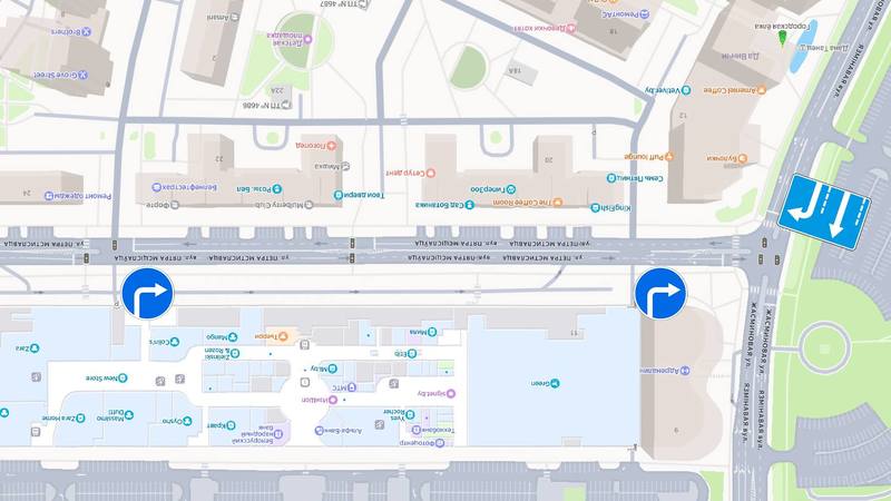 - при выезде с подземного паркинга ТЦ Dana Mall движение разрешено только направо, здесь установлены соответствующие дорожные знаки;