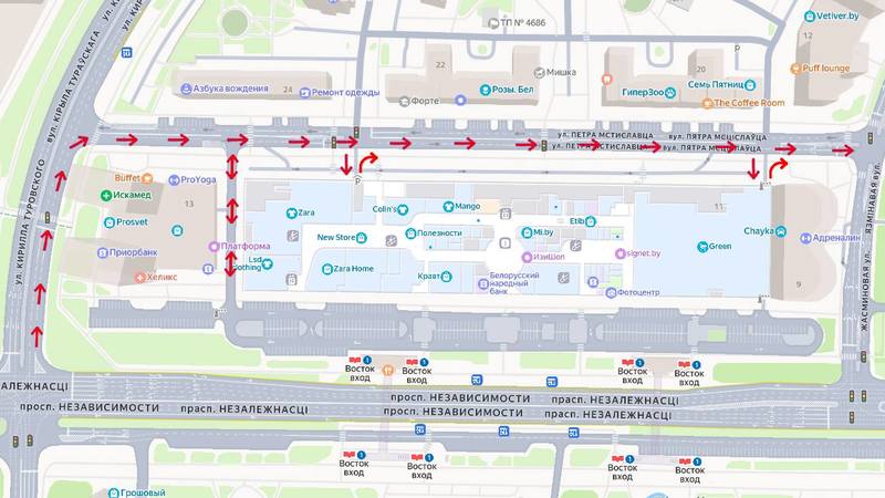 Для посещения торгового центра столичная ГАИ рекомендует заезжать на паркинг по маршруту: ул. Кирилла Туровского – ул. Петра Мстиславца. Выезжать следует по ул. Петра Мстиславца — ул. Жасминовая.