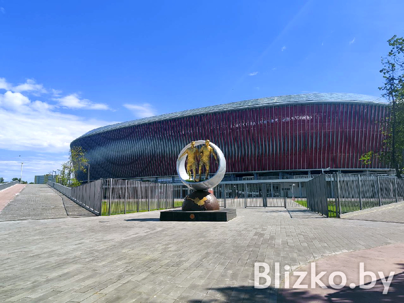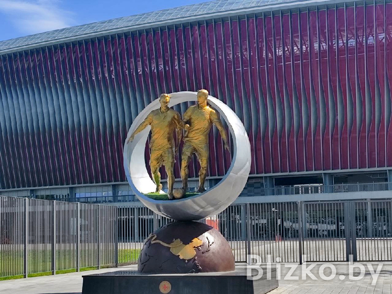 Отметим и то, что на входе на стадион установлена скульптура футболистов. Она изображает двух футболистов, которые стоят в некоем подобии кольца, установленном на глобусе. На самом глобусе при этом также позолочены Китай и Беларусь, две страны связывает позолоченная же лента. Стадион строился силами китайских подрядчиков.