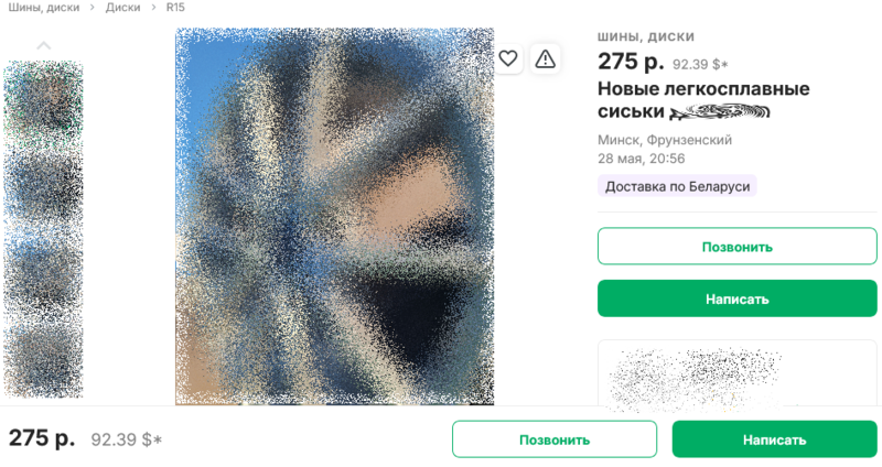 На одной из площадок частных объявлений появилось довольно странное предложение. А именно: «легкосплавные сиськи» по 275 рублей за штуку. Но покупать надо комплектом из 4 штук сразу. Гарантия 12 месяцев.