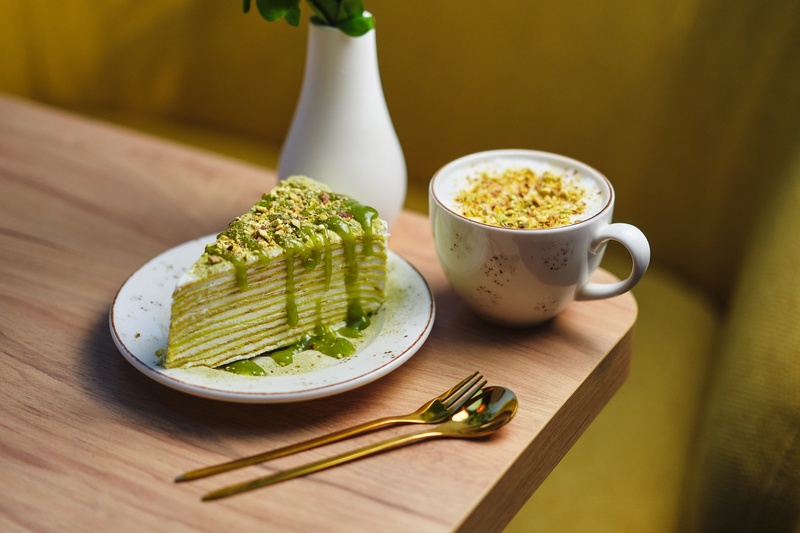 - Японский фисташковый торт (многослойный блинный торт с несладким взбитым кремом, дополнен густым фисташковым топпингом и дробленой фисташкой), 170 г