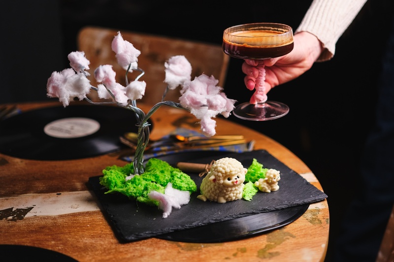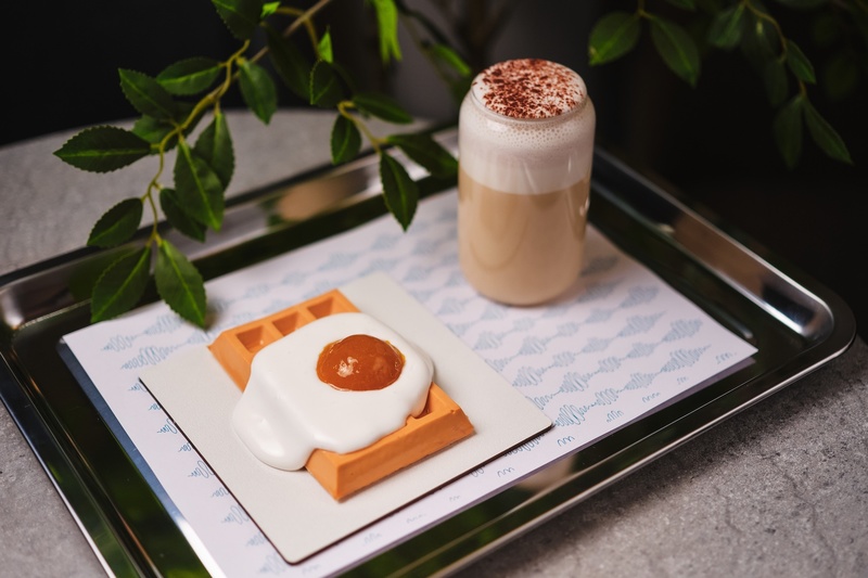 - Венская вафля с глазуньей (десерт на основе воздушного бисквита со слоем сливочно-творожного мусса, напоминающий венскую вафлю. Сверху — глазунья из мангового кули и домашнего маршмеллоу), 140 г