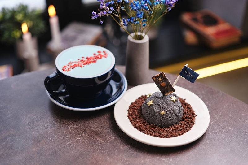 - Десерт «Предсказание Луны» (мусс на темном шоколаде, сердцевина из заварного орехового крема, шоколадный бисквит и хрустящий слой из шоколада и пралине, подается с шоколадным крамблом), 130 г
